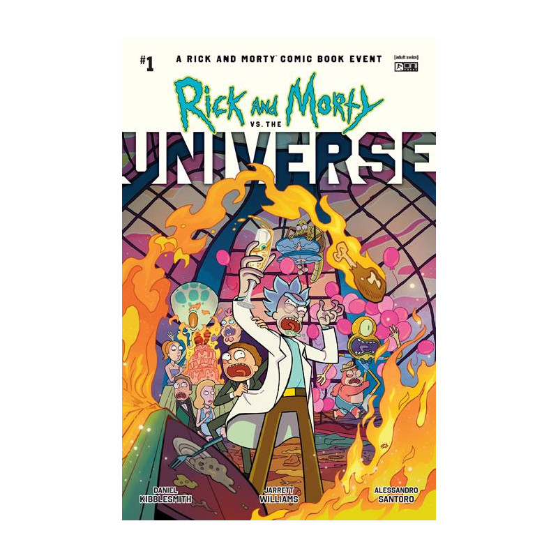 MOVE OVER, BIG BANG! GET WRECKED, BIG CRUNCH! GALAXIES COME AND GALAXIES GO, BUT OUR PLANE OF EXISTENCE HAS NEVER FACED ANYTHING AS CONSEQUENTIAL AS . . . THE FIRST-EVER RICK AND MORTY COMICS EVENT! From the deviant psyches of comics mastermind and multiple Emmy Award-nominee Daniel Kibblesmith (Loki) and artistic annihilator Jarrett Williams (Speed Force), this summer’s seven-part countdown to the end of everything that was, is, and will be begins with . . . a bachelor party that gets a little out of hand? Rick’s old buddy Dimension C-137 (where Rick and Morty Cronenberg’d Earth) has reached his UNIVERSAL HALF-LIFE and is getting MARRIED-to the female-presenting embodiment of the Parmesan Dimension! He’s found true love and wants his old pal Rick to plan his bachelor party! WHAT COULD GO WRONG? Answer: Pretty much everything . . . and it is all Rick’s fault! Now Rick and Morty are on the run from EVERY SINGLE UNIVERSE THEY’VE EVER MESSED WITH-meaning, no matter what dimension they escape to, the universe will literally be against them. And, to survive, Rick will be forced to something he hoped he would never have to do-a last resort of EPIC PROPORTIONS! DON’T CALL IT A CRISIS! The FIRST RICK AND MORTY COMICS EVENT starts here with a cosmos-colliding spectacular TOO BIG FOR TV . . . and featuring, well, EVERYONE!