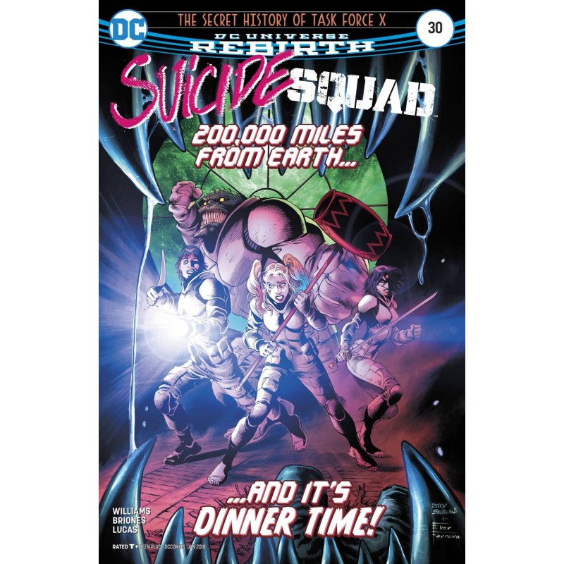 "THE SECRET HISTORY OF TASK FORCE X" part four! The very first threat faced by the original Task Force X was a creature known as the Red Wave, a beast with the power to reduce the whole planet to ashes-and Harley Quinn's heading right for it! But before Deadshot can warn the clown princess, his team is set upon by an army the likes of which the Squad's never seen before. Someone is desperate to protect the secret of Task Force X, even if it means destroying Amanda Waller herself!